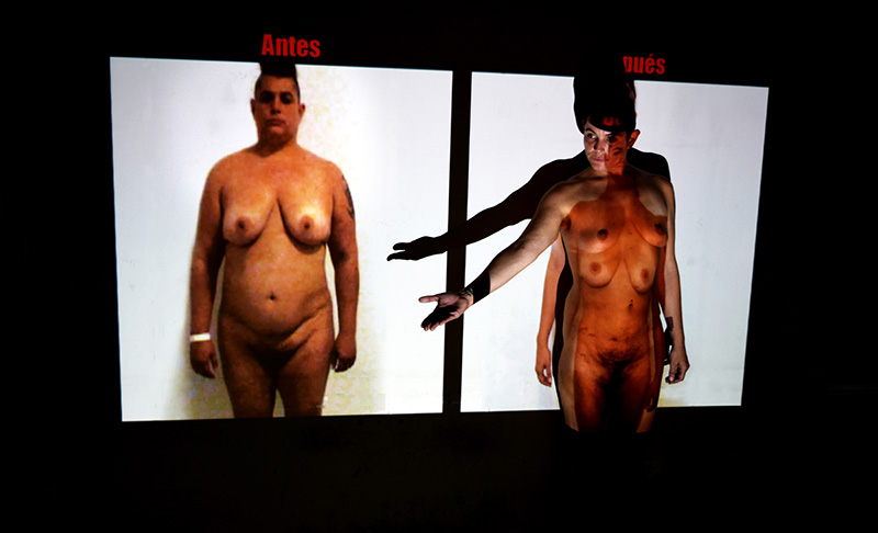The body before or the body now, which one do you prefer? The performance is an interactive multimedia game in which the viewer is a player / participant invited to choose between versions of one body: BEFORE or AFTER. Then he or she must try to snap the body of its choice with the real body of the performer. This is a struggle-game between bodies trying to fit and to not. At the same time an audio combines game instructions, with some testimonials of the performer about eating disorders and weight loss operation, gastric sleeve.
